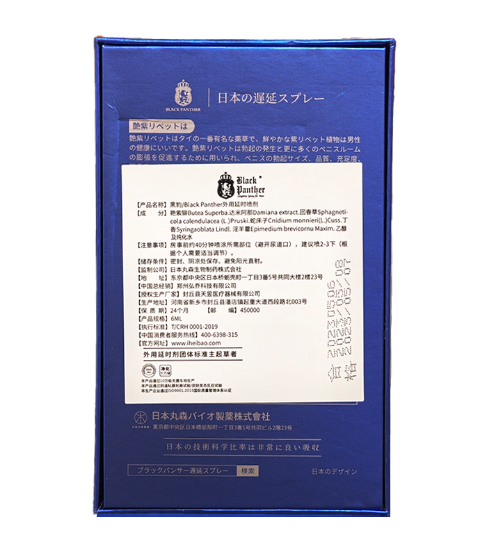 | 中文名 | 黑豹持久液 | 健保局衛生許可證號 | (2201)第1648號 | ||