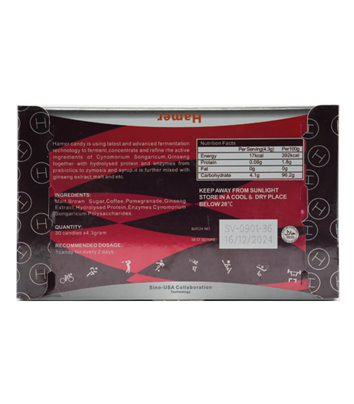 汗馬精力糖(Hamer Candy)是由獨特的配方製成,主要成分鎖陽含有細胞健康所需的營養。汗馬精力糖是純天然食品,能幫助補充細胞營養,本産品的安全度非常高,所有原料均為食品.