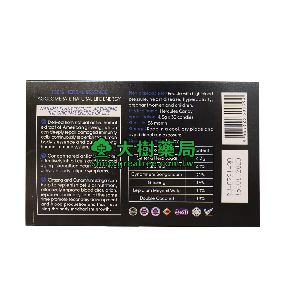 大力神椰子糖(Hercules)歷經15年研發而成,也是馬來西亞原裝進口的一款精力糖,在台灣也叫悍馬糖、hamer糖、汗馬精力糖。汗馬糖主要成分為鎖陽、人參,主要功效是補益陽氣,養筋健骨,補氣養血,緩解血虛型便秘,汗馬精力糖由於快速補充人體細胞營養,延緩老化進程非常有效,數年來已成為運動員首選的細胞營養產品。