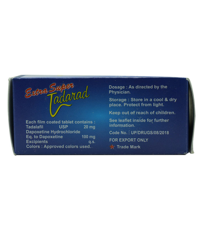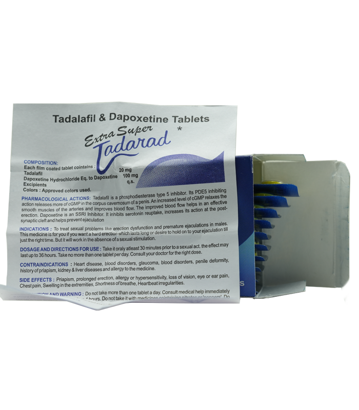 Extra Super Tadarad 又名:超級犀利士或者超級偉哥,這是一種混合錠劑,包含兩種活性成分:犀利士20毫克(Cialis)和必利勁100毫克(Priligy)。犀利士是一種治療男性勃起功能障礙(陽痿)的藥物,而必利勁是一種治療早洩的藥物。合併使用這兩種成分可以同時治療這兩種男性性功能障礙,並顯著提高勃起的硬度和延長持久性,從而增加性生活的品質.