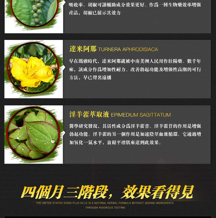 2、精良搭配比例:VIGRX PLUS威樂的每一種成分都是搭配用量,堅持使用頂級原料,絕不使用劣質材料,按照配方成分配比,保證用戶的使用效果。